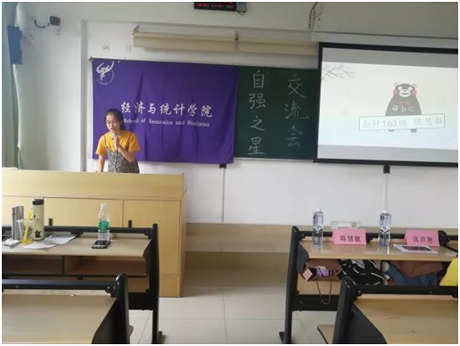蒋燕惠同学在2016—2017学年荣获多项荣誉奖项,其中包括优秀学生、党建理论部部门之星、国家励志奖学金并在多次比赛荣获优秀奖等,交流会上与我们分享了她这两年不断尝试的经历,并鼓励大家勇于去探索自己未知的领域。