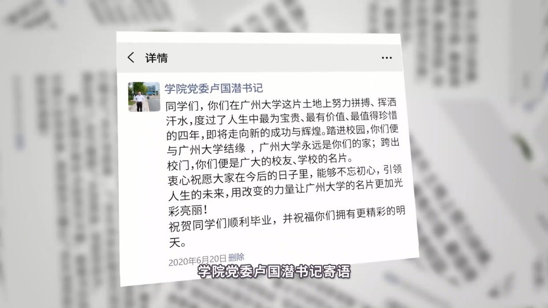 另外,卢书记结合此次疫情让同学们意识到中国共产党领导的制度优势,并勉励2016级毕业学子勇敢面对挑战,及早做好自我定位,先知先觉,抢抓机会,先就业再择业,先生存再寻梦;最后,卢书记衷心祝愿全体毕业生在今后的日子里,能够不忘初心,引领人生的未来,用改变的力量让广州大学的名片更加光彩亮丽!
