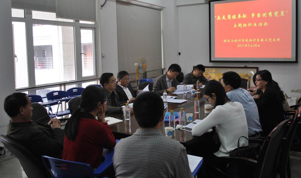 3月28日下午,会计系教工党支部在学院412会议室召开 “立足岗位奉献,争当优秀党员”的主题组织生活会。学校校长魏明海教授以一名普通党员的身份与会计系教工党支部全体党员一道,结合“两学一做”学习教育及参照“四讲四有”标准,就如何“立足岗位奉献,争当优秀党员”主题畅所欲言,党员同志们都根据自身实际,谈工作谈思想并积极开展批评与自我批评,气氛热烈、积极,互动良好,取得了良好的效果。魏明海校长对此次组织生活会给予了充分肯定并对下一步支部建设提出了两点要求:一是通过开好民主生活会为契机,加强组织建设,充分发挥党支部战斗堡垒和先锋模范作用;二是要执行好“三会一课”制度,集思广益,切实提高民主生活会的质量,通过批评与自我批评,党员互相帮助,强化教师党员的业务观。此外,魏校长还通报了学校在高水平大学建设方面的有关情况并对会计学学科建设提出了一些指导性意见,全体与会党员都深受鼓舞。