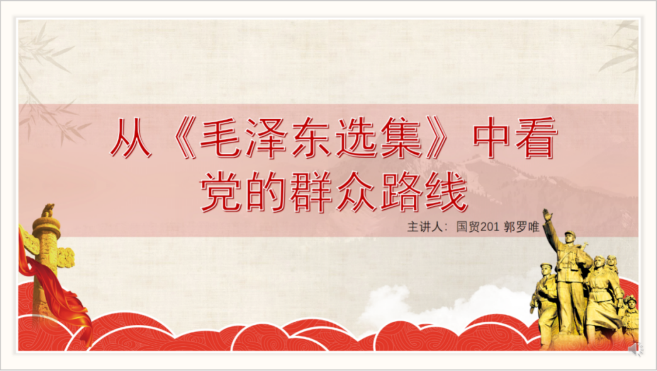 为了倡导提升自身科学文化与思想道德素质,弘扬党团精神,国贸201团支部于2020年11月3日开展了专题微团课活动。课程以PPT课件展示的方式呈现,首先以《毛泽东选集》中关于群众路线的语段作为引子,引出群众路线这一核心内容。然后详细介绍了群众路线的内涵、意义以及十九大报告中强调的群众路线相关内容。目的是引导同学们虚心向群众学习,与周围青年构建良好关系,继承伟大领袖的先进思想,为实现中华民族的伟大复兴而努力奋斗。