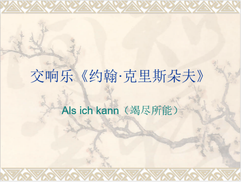 《约翰•克里斯托夫》是一部气势磅礴的史诗,讲述了一个音乐天才的艺术发展过程。书中描述了一颗坚强刚毅的心是如何战胜自己心灵深处的阴暗面,由幼稚走向成熟,并叙说了一个真诚的音乐家是如何反抗虚伪轻浮的社会,从而在与社会反动势力的斗争中升华自己、完善自己,因而也是一部心灵史和成长史。同时这部小说又是一部音乐的史诗。作者用他对音乐精神的深刻理解,歌颂了一种充满生命力的音乐理念。
