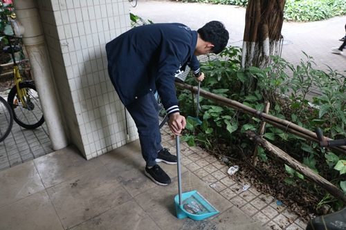 天空灰蒙,而胸前的党员徽章闪亮,大家的热情丝毫不受这沉闷天气的影响。党员们带来扫把、垃圾铲、抹布和水桶等清洁工具,在经过简单的小组和责任分工之后,各人拿着清扫工具就投入到此次的卫生大扫除行动中。你提水来我洗地,一齐来把栏杆擦,铲去墙上的牛皮癣,挑出绿化带中的杂屑,一会儿功夫就把垃圾桶填满了。经过一个中午的努力,宿舍公寓内大部分垃圾被清扫干净,墙面焕然一新。