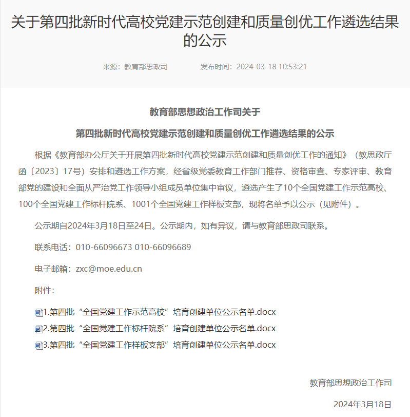 2024年3月18日,根据《教育部办公厅关于开展第四批新时代高校党建示范创建和质量创优工作的通知》(教思政厅函〔2023〕17号)安排和遴选工作方案,经省级党委教育工作部门推荐、资格审查、专家评审、教育部党的建设和全面从严治党工作领导小组成员单位集中审议,遴选产生了全国党建工作示范高校10个、全国党建工作标杆院系100个、全国党建工作样板支部1001个。