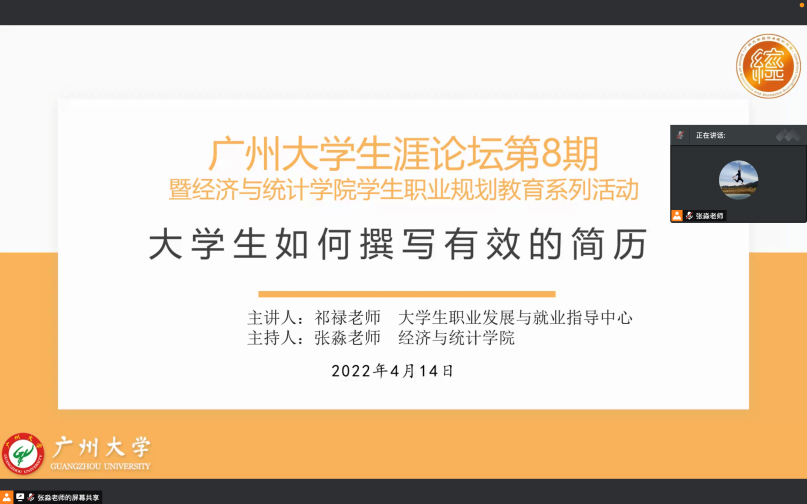 学生职业规划教育系列活动——大学生如何撰写有效的简历讲座顺利举办。本次讲座邀请到广州大学大学生职业发展与就业指导中心的祁禄老师,以线上的形式为同学们进行了细致的讲解。祁禄老师为广州大学祁老师工作室负责人,讲授《积极心理学》和《大学生职业发展与就业指导》等课程,参与国家课题10余项,公开发表论文20余篇,编写了多本与学生职业生涯教育相关的教材,多年来致力于为大学生提供职业发展与就业指导。会议由2018级辅导员张淼老师主持。
